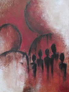 2022Acrylic paint, pieces of textile and paverpol on canvas. The figure at the front of the painting seems to keep his distance to the figures on the background. Seems withdrawn and yet you also feel a kind of engagement. The need to take a break, taking a moment to yourself in the hectic pace of the day...
